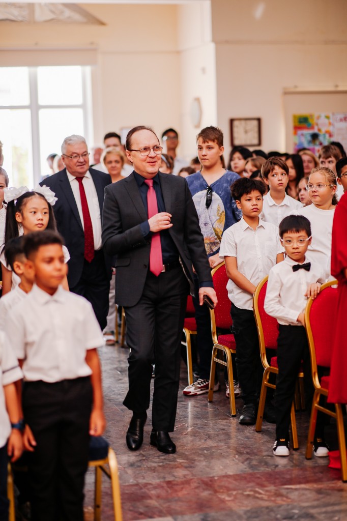 Чрезвычайный и Полномочный Посол России во Вьетнаме Геннадий Степанович Бездетко сердечно поздравил и поблагодарил учителей нашей школы, пожелал им творческого вдохновения, терпения, благодарных учеников. Геннадий Степанович с теплотой и любовью вспомнил о своей первой учительнице, а школьникам пожелал сил и здоровья на пути освоения знаний.
